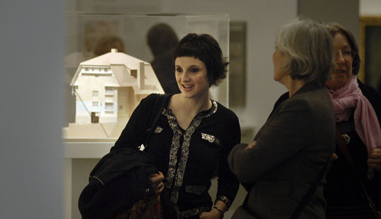 Olbrichs Urenkelin Bettina Widlar-Rainer vor dem Modell des Hauses Olbrich