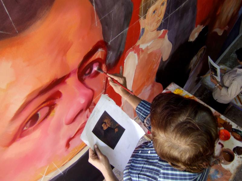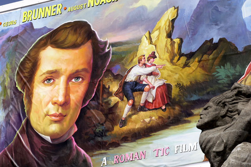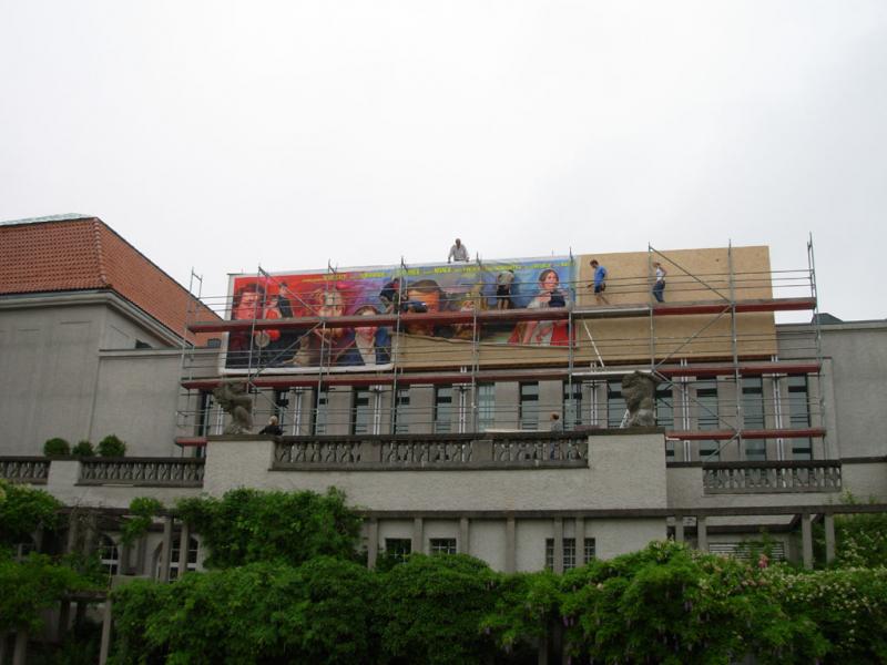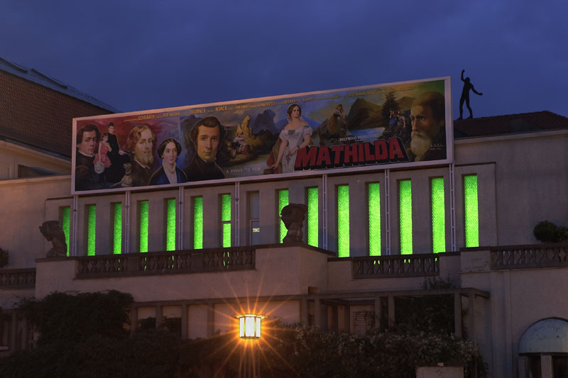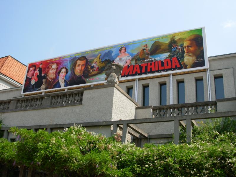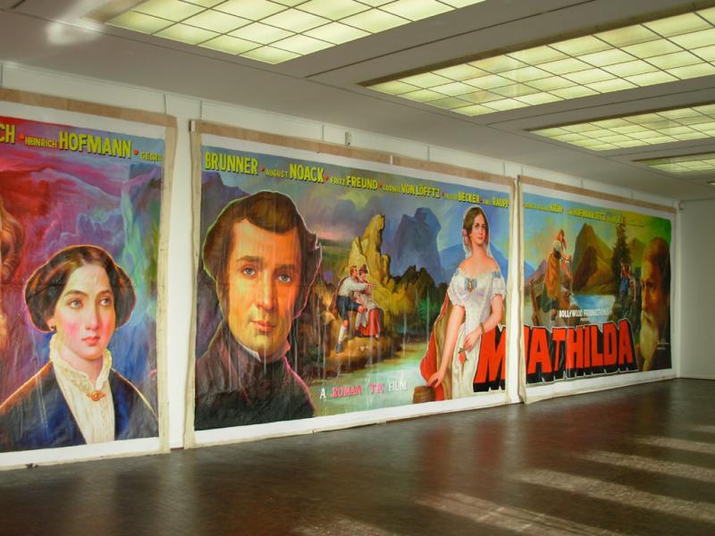 „Mathilda goes Bollywood“: Aus Mumbai/Indien kommt das gigantische Gemälde im Cinemascope-Format (4 x 18 m), das der in München geborene und in Berlin lebende Videokünstler Julian Rosefeldt (*1965) im Bollywood-Plakatstudio Balkrishn in Auftrag gegeben hat. „Mathilda“ heißt der Film, in dem die kaum mehr bekannten Darmstädter Meister des 19. Jahrhunderts groß herauskommen: weithin sichtbar auf dem Dach des zum Filmpalast mutierten Ausstellungsgebäudes.