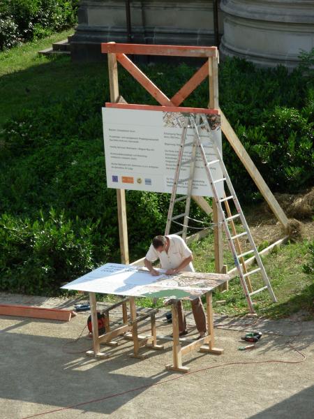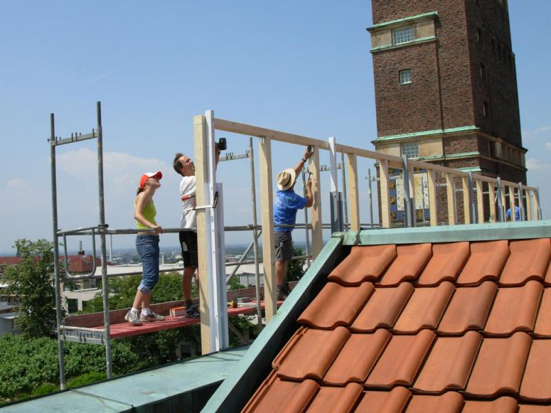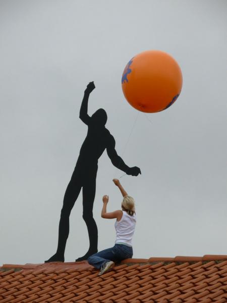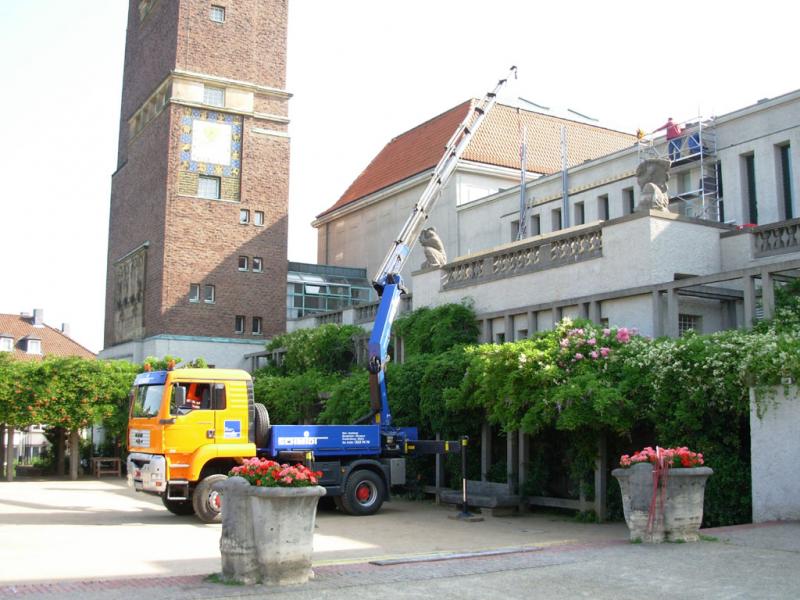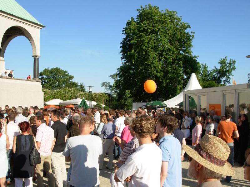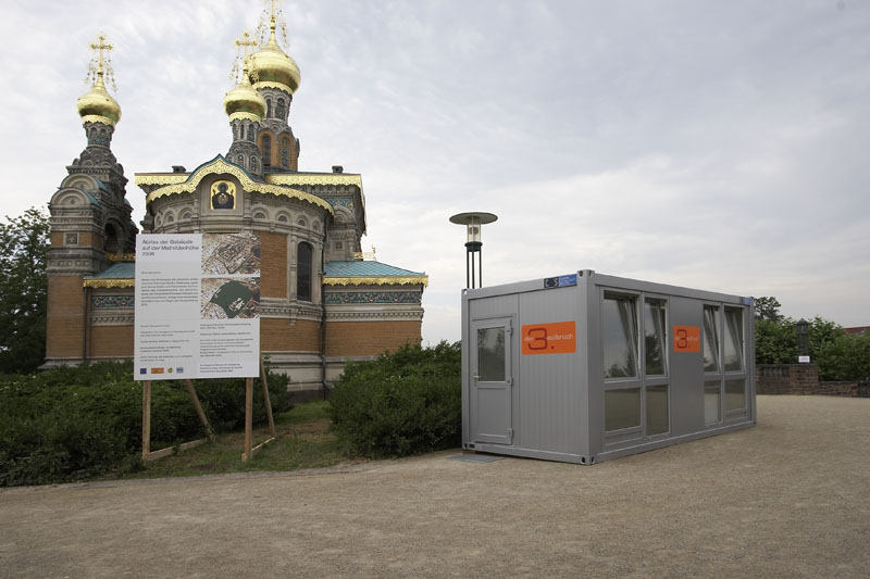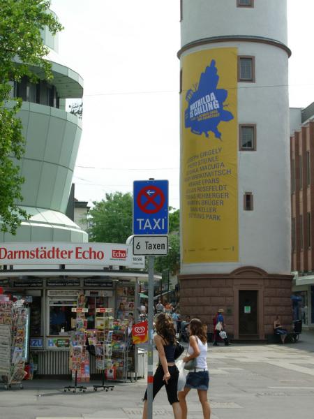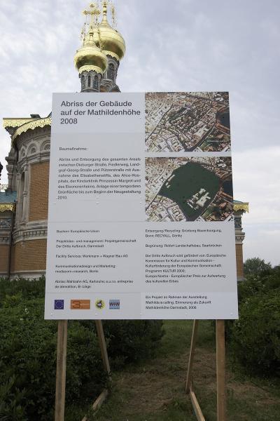 Vom bahnbrechenden Aufbruchsgeist der Künstlerkolonie um 1900 beflügelt, bereitet uns der im Odenwald geborene und in Darmstadt lebende Installationskünstler Martin Brüger (*1965) mit seinem unweit von Schwanentempel und Russischer Kapelle platzierten Infocontainer samt Werbetafelauf eine radikal neue Zukunft der Mathildenhöhe vor: „Abriss der historischen Substanz – neuer Freiraum für zeitgenössische Aktivität“, so lautet das von ihm initiierte Bauvorhaben für 2008.