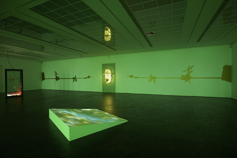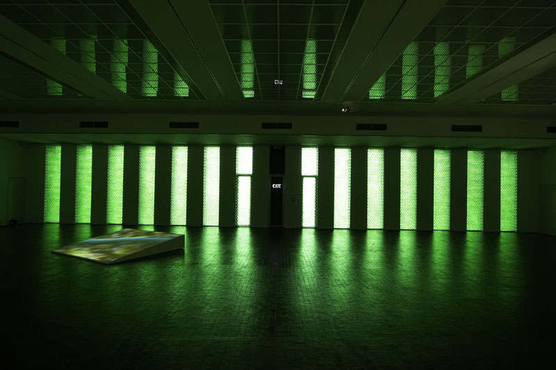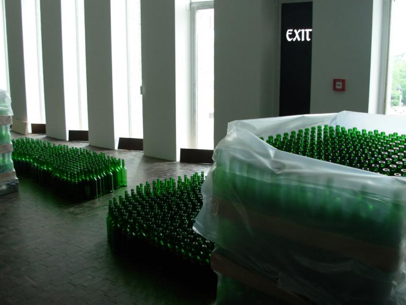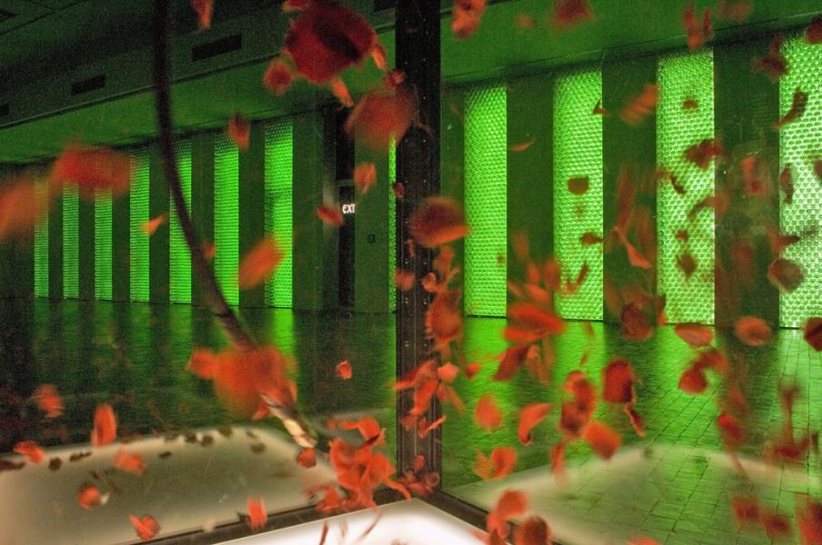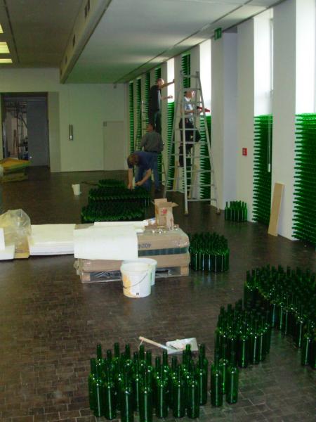 6.500 leere Bordeauxflaschen, durchflutet vom Sonnenlicht, tauchen den einst offenen, weinumrankten Rosenhof erstmals wieder in vegetatives Grün. Die wechselvolle Geschichte des Ortes kommt damit ebenso ins Spiel wie der euphorisierende, doch allzu vergängliche Rausch der Lebensreformbewegung um 1900. Der in Berlin lebende Zürcher Multi-Media-Künstler Rémy Markowitsch (*1957) entfesselt in seinem betörend-irritierenden Grünraum gezielt Natur- und Kulturgewalten. Wachsen aus den Raumecken riesige schwarze Rosen heraus, so schlägt in einem gläsernen Brunnen immer wieder ein Schlauch voll heißer Luft um sich: Sinnbild scheiternder Lebensreformen nach 1900 – oder auch Abbild heutiger Haltlosigkeiten?
