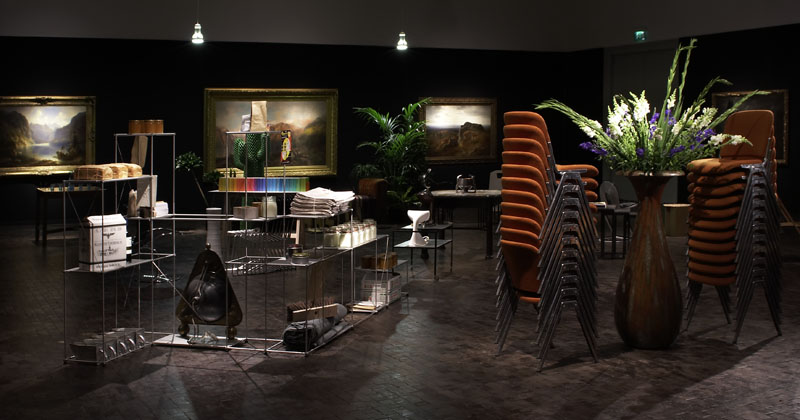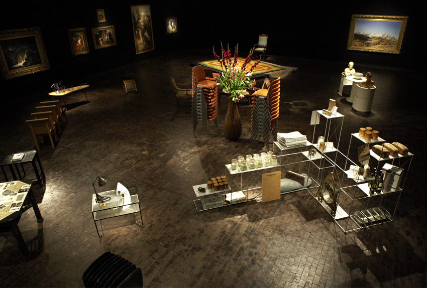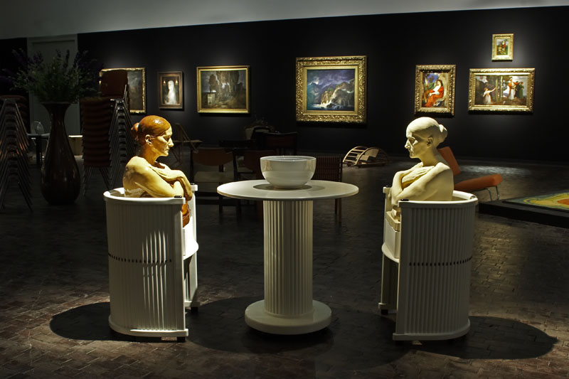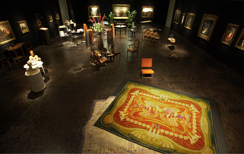 „Mathilda meets Böcklin“: Im gigantischen Oberlichtsaal, den die in London lebende polnische Künstler-Kuratorin Goshka Macuga (*1967) bespielt, glühen rundum auf der schwarzem Wandbespannung die Schätze der städtischen Gemäldesammlung auf: allein elf Werke des Jahrhundertwendemalers Arnold Böcklin, eingebettet in die Landschaftsmalerei seiner Zeit. Im Raum selbst wandert der Besucher, von einer Stimme im Ohr geführt, zwischen Interieur-Inseln aus Stühlen, Tischen, Teppichen, Palmen und Regalen umher, die mit Kultur- und Designelementen aus allen Bereichen des kreativen Schaffens vom Jugendstil bis heute eine überwältigende Raumlandschaft entstehen lassen.