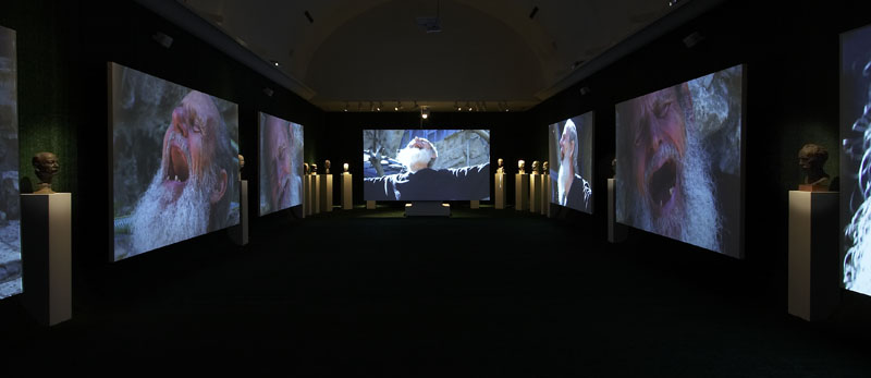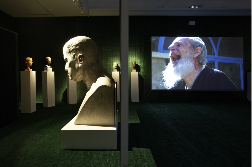 Lachen, weltweit: Der in München geborene und in Mailand lebende Video-Künstler Piero Steinle (*1959) holt es für uns auf die Mathildenhöhe. So wie er die zahlreichen, in Vergessenheit geratenen Büsten des 19. Jahrhunderts aus den Tiefen des hauseigenen Sammlungsdepots ins Licht rückt. Das Ergebnis ist eine auf alle Sinne wirkende Multi-Media-Installation, die das Kollektiv der in artifizieller Würde erstarrten Stadt- und Kulturprominenz von einst auf die Lachclubs der Gegenwart mit ihrer künstlich erzeugten Heiterkeit treffen lässt und Zwang wie Befreiung physisch-psychisch erlebbar macht.