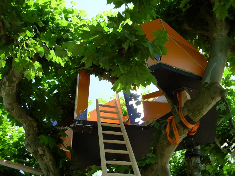 Auf Platane Nr.168 lässt der in Esslingen geborene und in Frankfurt lebende Tobias Rehberger (*1966), ein permanenter Grenzgänger zwischen Kunst, Design und Architektur, sein futuristisch zersplittertes Baumhaus bauen: halb verunglücktes Ufo, halb orange-lila Blüte im grünen Blätterdach. Ein „Künstlerhaus“ anno 2006 inmitten des ältesten Kulturterrains der Mathildenhöhe, dem um 1800 angelegten Platanenhain. Sein suggestiver Name: „Ausgesetztes Waisenkind III“.